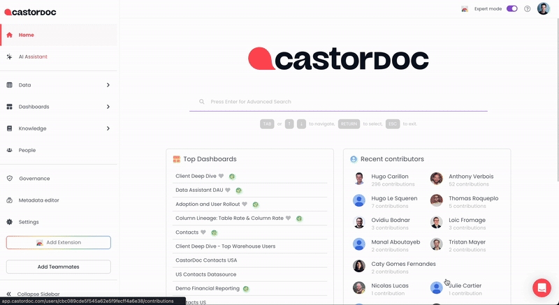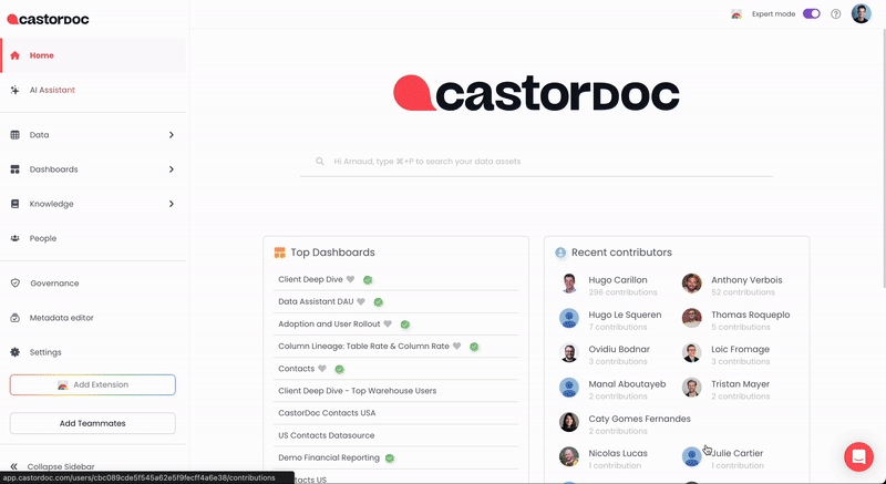 When looking at a dashboard on Tableau, Looker, Power BI, etc., your users can ask any question about how the dashboard is built and where the data comes from, right from the Catalog browser extension. Use it in the Catalog browser extension.